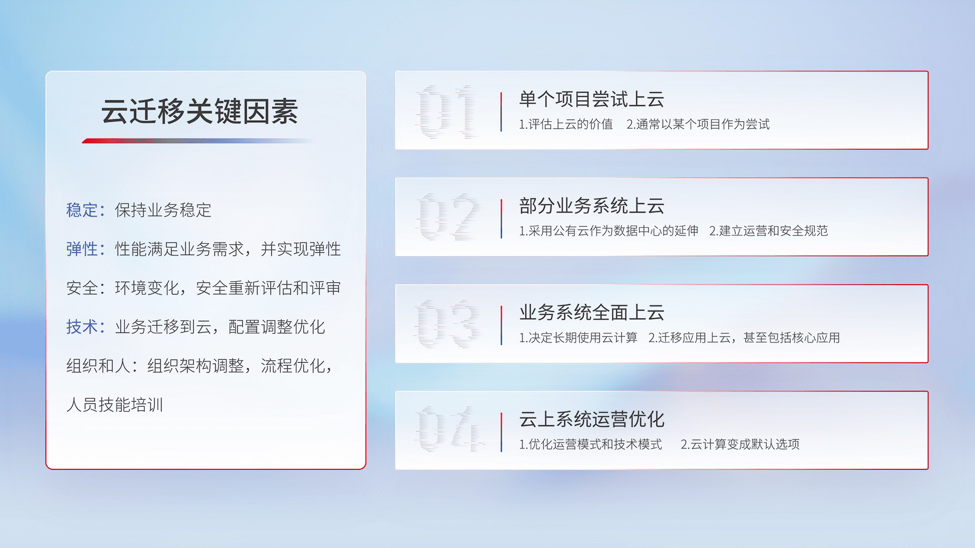 结合实际业务,,从规划设计、、云平台选型、、云原生改造、、、、数据迁移、、、集成交付,,,,迁移全过程为客户识别最佳上云路径,,,,做好风险识别管理,,,,设计网络架构、、、、身份权限、、、安全审计合规、、操作审计、、日志审计、、、监控告警策略、、、、多站点容灾设计等,,,对云上基础设施进行整体规划,,,,提升IT治理水平,,,以满足弹性、、、、高可用、、高性能的需求。。